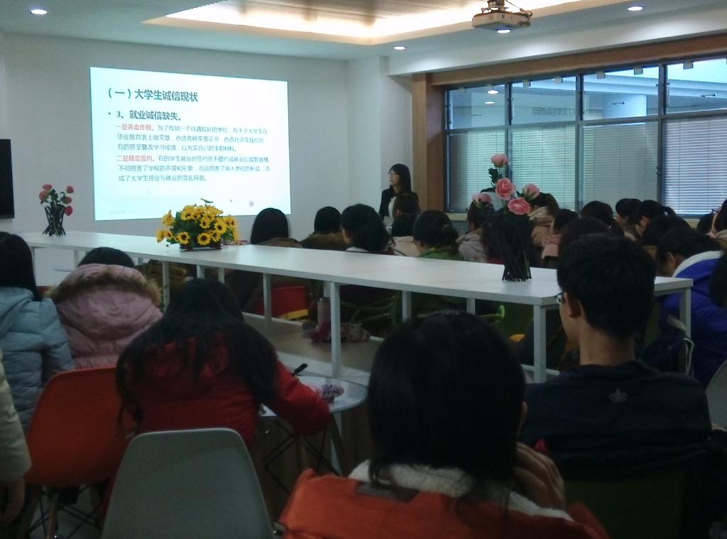 首先,研究生党支部组织大家学习了《国家教育考试违规处理办法》和“六个严禁”、“五个一律”等有关规定要求,要求同学们在2015年硕士研究生入学考试举行时,不得参与违纪作弊行为。随后,座谈会由 “学习诚信缺失”、“生活诚信缺失”、“就业诚信缺失”等大家息息相关的问题展开,强调了诚信是塑造健康人格的道德基础,是全面发展的基本前提,是进入社会的通行证。学院要求研究生同学积极加强自身道德修养,做诚信的践行者,努力做到学思并重,内省慎独,知行统一,做一个诚信的人。针对即将到来的学期考试,与会同学积极倡议: