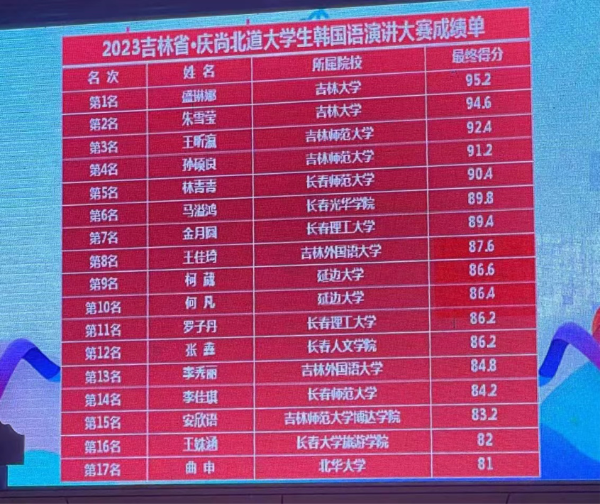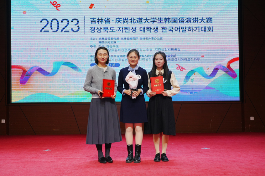 2023年10月31日,由吉林省委宣传部、吉林省教育厅、吉林省外事办公室、韩国庆尚北道主办,吉林省外事办公室翻译中心、吉林省人民对外友好协会亚非部承办的2023吉林省•庆尚北道老员工韩国语演讲大赛在长春乐府酒店举办。来自ylzzcom永利总站线路通道、延边大学等吉林省12所高校的18名参赛选手同台竞技。朝鲜语专业2022级员工盛琳娜和2020级员工朱雪莹在公司朝文系金晶银老师的指导下代表ylzzcom永利总站线路通道参加比赛,初赛入选后在决赛中分别获得第一、第二名。盛琳娜同学荣获一等奖、朱雪莹同学荣获二等奖,盛琳娜同学获得庆尚北道提供的赴韩研学机会。
