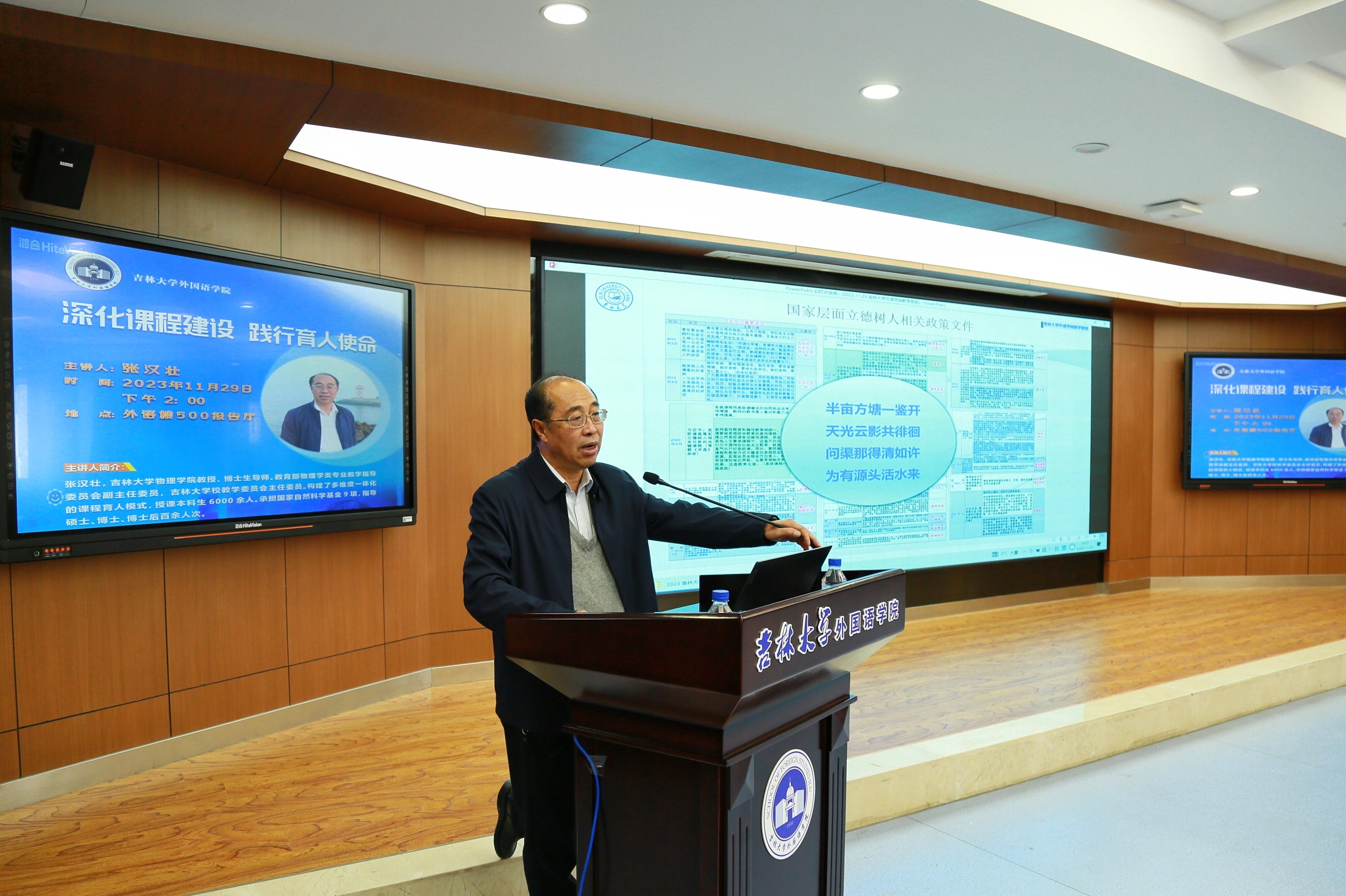 为提高ylzzcom永利总站检测网址课程建设水平,促进教学创新与教学方法改革,2023年11月29日,张汉壮教授接受学院邀请以“深化课程建设,践行育人使命”为题作报告。张汉壮教授为国家“万人计划”教学名师,“全国五一劳动奖章”“全国杰出教学奖”“宝钢优秀教师特等奖”获得者,是《力学》《物理与人类生活》《物理学导论》《电的产生与传输原理虚拟伪真实验》四门国家级线上一流课程负责人。